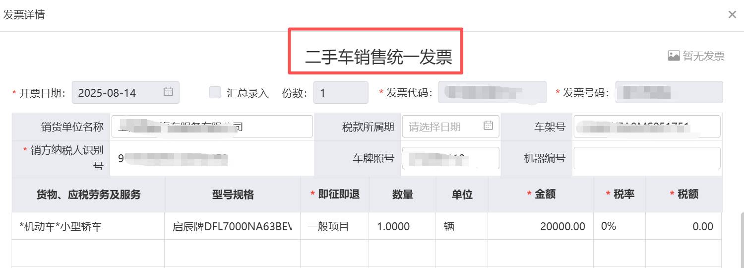 1. 二手車銷售統(tǒng)一發(fā)票(稅率0%):
