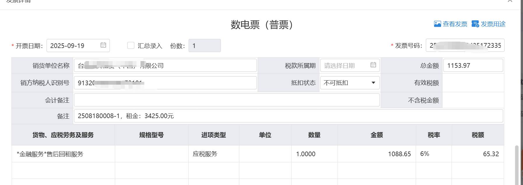 3. 售后回租服務普票(6%稅率):