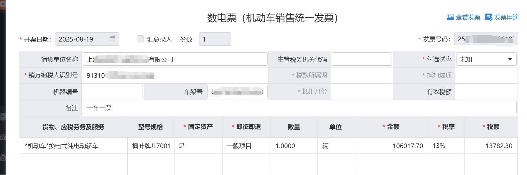 2. 機動車銷售統(tǒng)一發(fā)票(13%稅率):