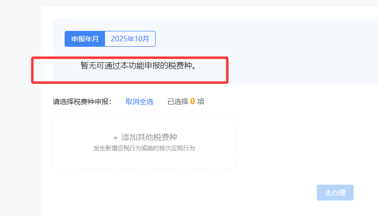 您遇到的情況是因?yàn)楫?dāng)前申報(bào)功能中暫無(wú)可用的稅費(fèi)種,系統(tǒng)提示“暫無(wú)可通過(guò)本功能申報(bào)的稅費(fèi)種”。
