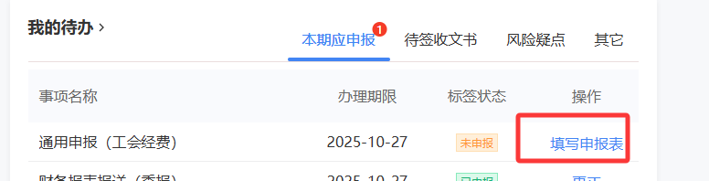 但您在“我的待辦”中看到“通用申報(bào)(工會(huì)經(jīng)費(fèi))”有申報(bào)任務(wù),說(shuō)明該事項(xiàng)已生成。