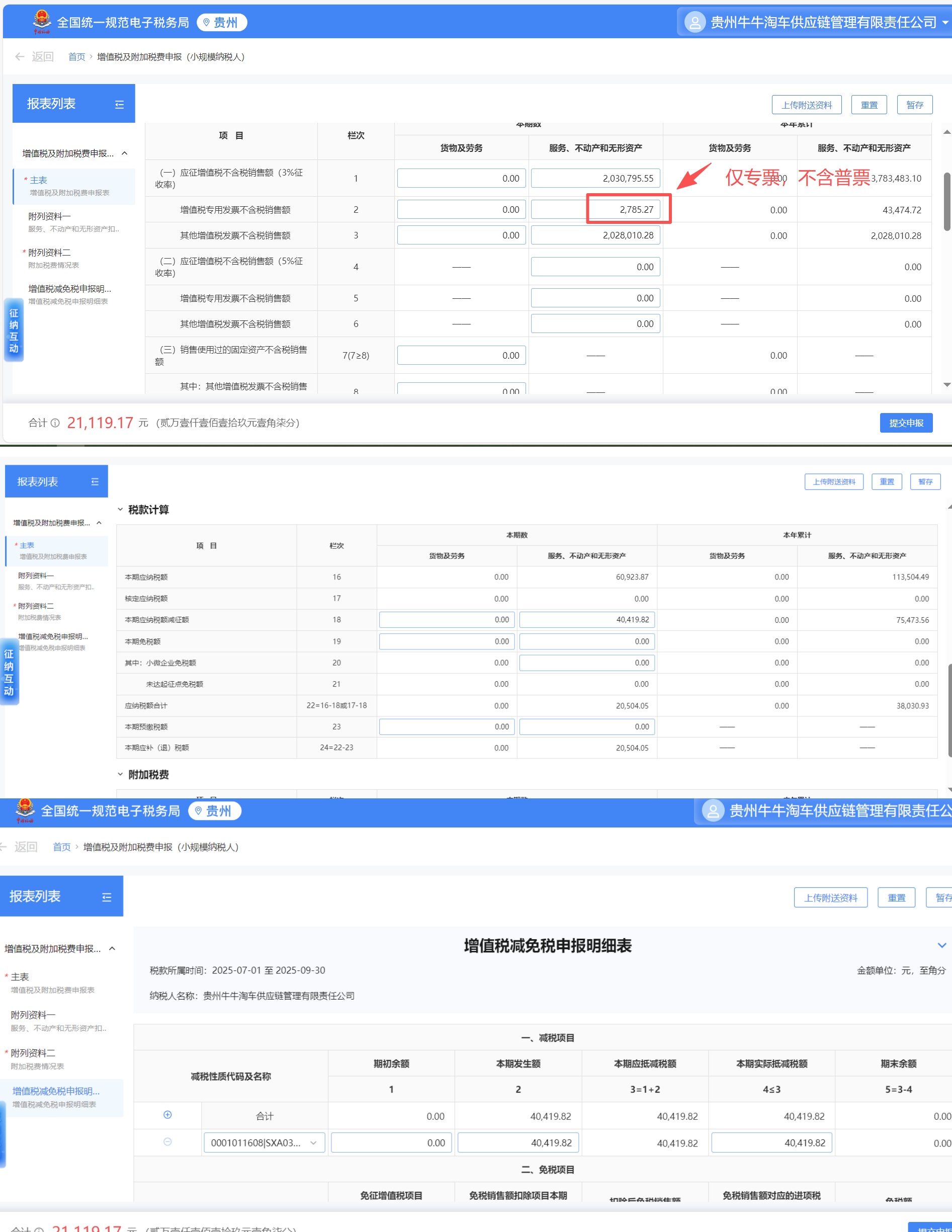 你填的專票不含稅收入是 2785.27元,但系統(tǒng)根據(jù)你開具的專票計(jì)算出的含稅銷售額合計(jì)為: