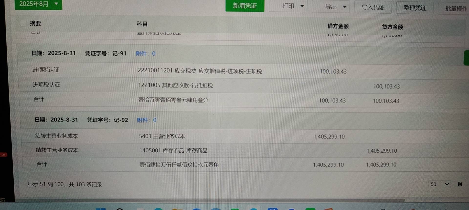 1. 確認發(fā)票狀態(tài):確保8月已認證的發(fā)票(如你圖中2025-8-31的100,103.43元)已在稅務系統(tǒng)完成勾選確認,且未重復申報。