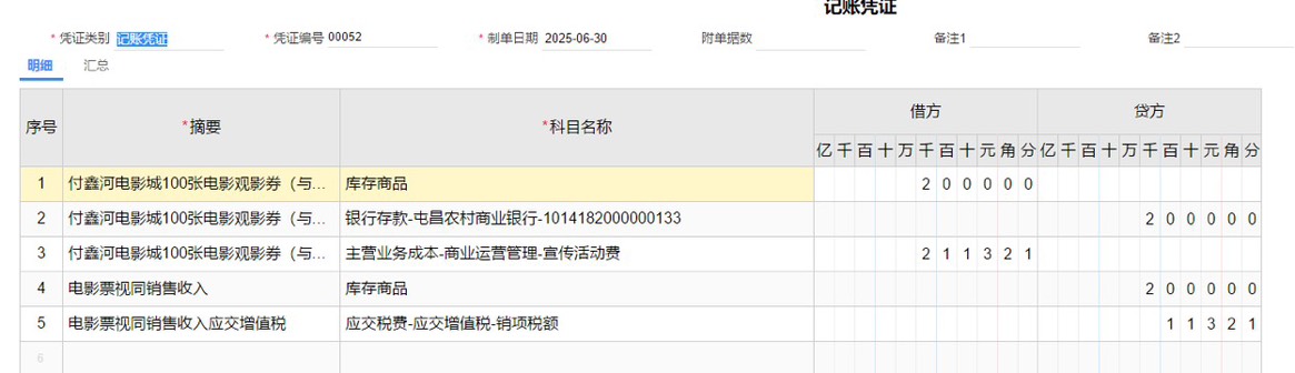 3. 電影票視同銷售時,增值稅應按“視同銷售”處理,確認銷項稅額,但您此處已做收入與稅金,可能重復。