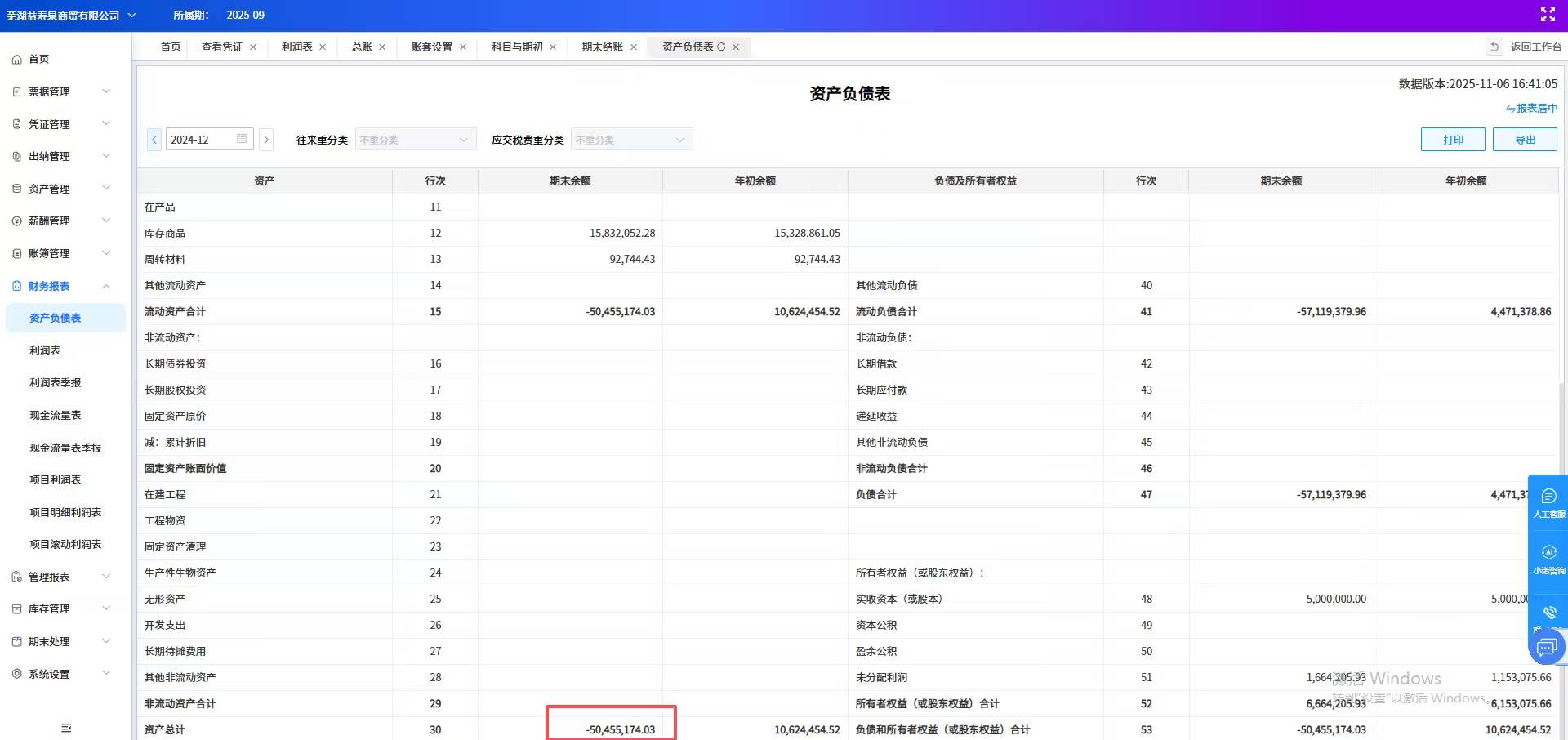 主要問(wèn)題出在“流動(dòng)資產(chǎn)合計(jì)”和“非流動(dòng)資產(chǎn)合計(jì)”都顯示為負(fù)數(shù)(-50,455,174.03),這說(shuō)明可能存在科目余額方向錯(cuò)誤,比如把貸方余額記成了借方,或數(shù)據(jù)錄入反了。