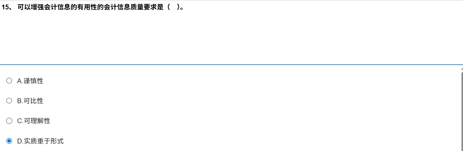 - 選項(xiàng)D:實(shí)質(zhì)重于形式要求企業(yè)應(yīng)當(dāng)按照交易或者事項(xiàng)的經(jīng)濟(jì)實(shí)質(zhì)進(jìn)行會計(jì)確認(rèn)、計(jì)量和報告,不應(yīng)僅以交易或者事項(xiàng)的法律形式為依據(jù)。它是保證會計(jì)信息反映經(jīng)濟(jì)實(shí)質(zhì),是會計(jì)信息質(zhì)量的重要原則,但不是直接“增強(qiáng)”有用性的要求。