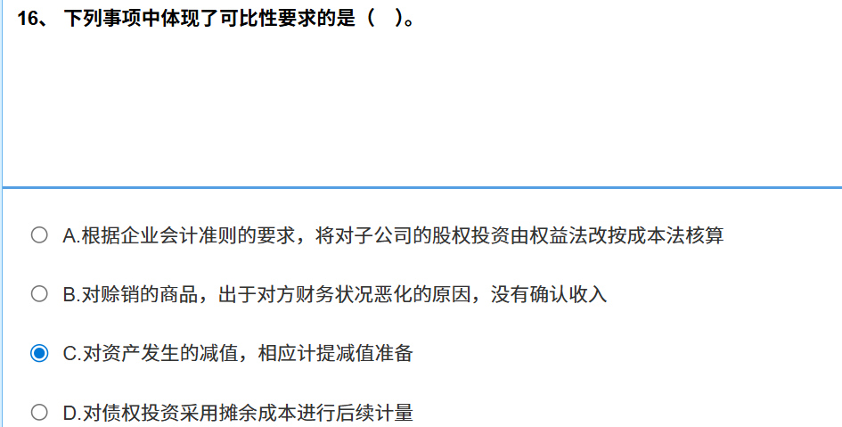 - D選項:債權(quán)投資用攤余成本計量是計量屬性的選擇,不直接體現(xiàn)可比性。