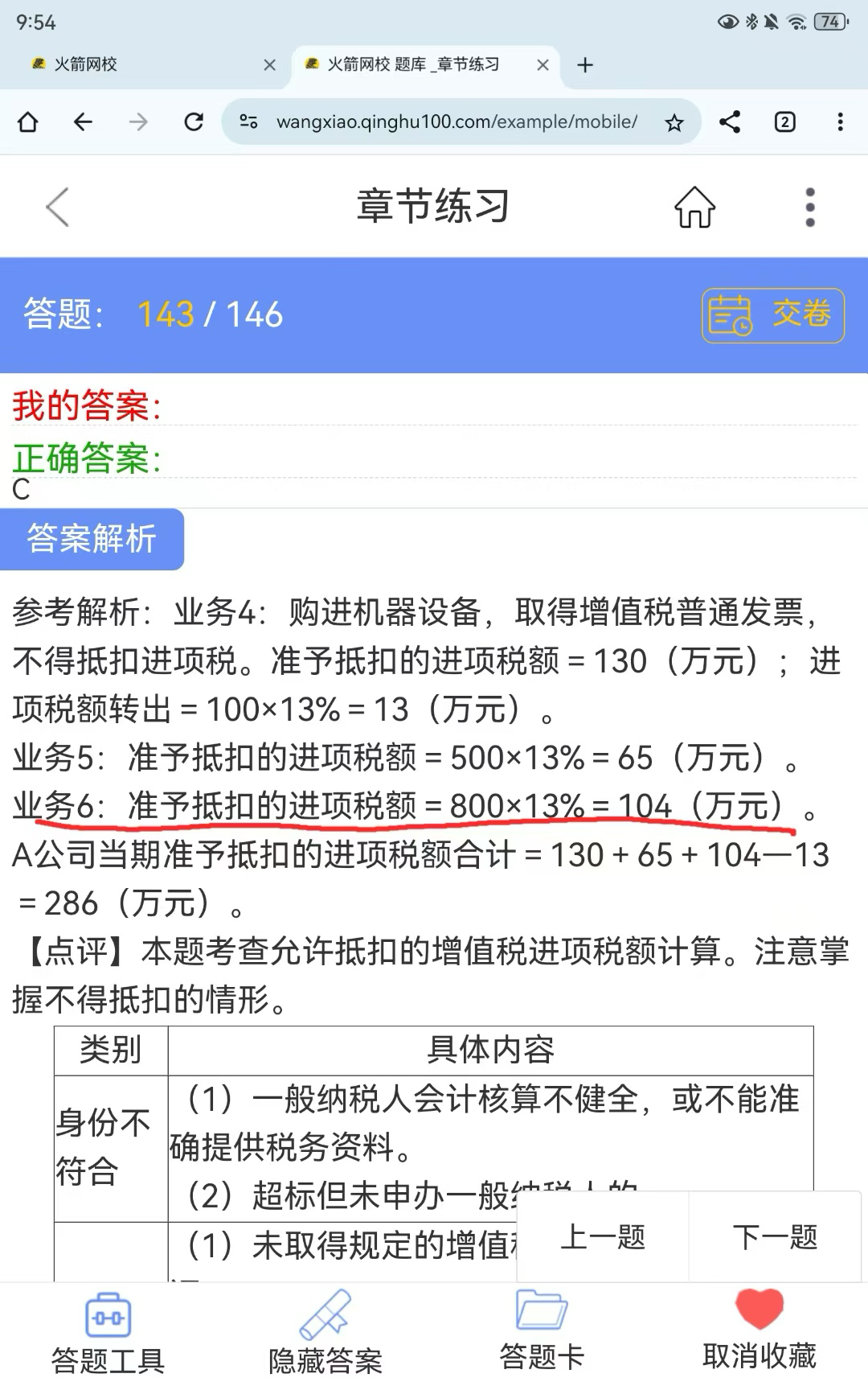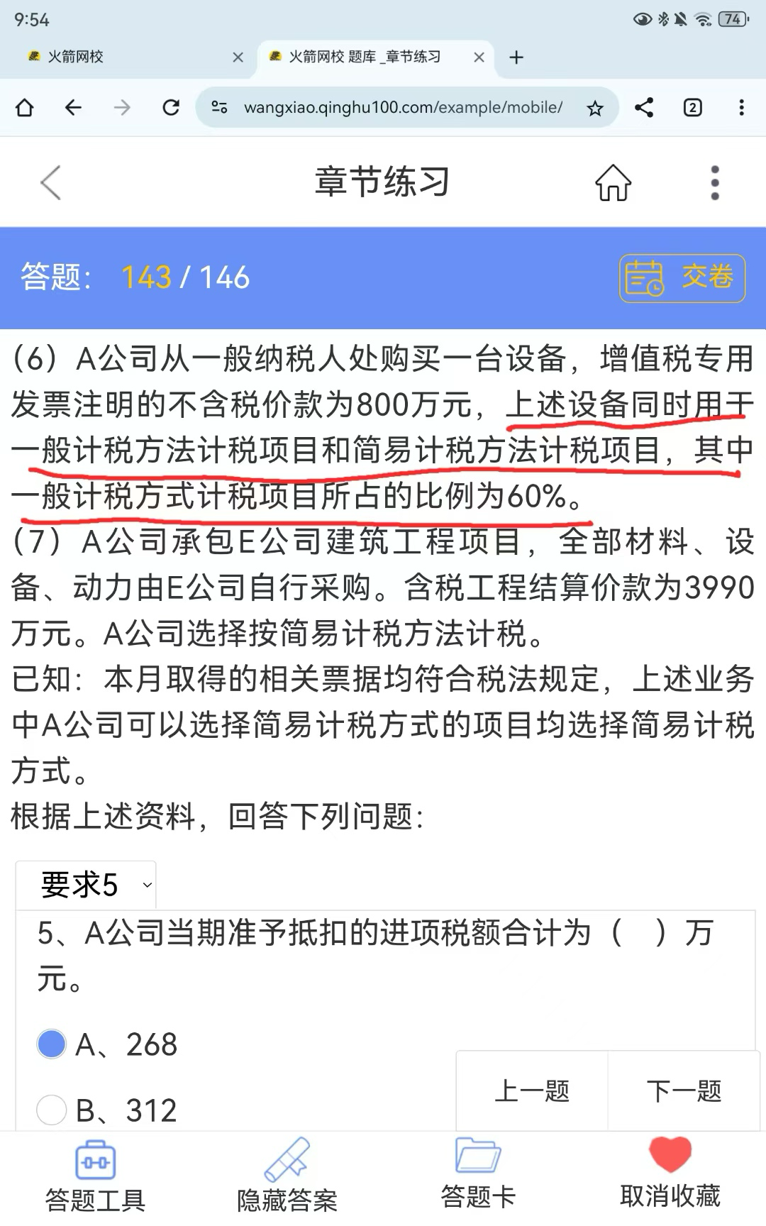 題目中業(yè)務(wù)6的設(shè)備購進,取得的是增值稅專用發(fā)票,可全額抵扣進項稅額(800×13%=104萬元),然后不需剔除用于簡易計稅的部分——因為只要能合理劃分用途,允許按比例抵扣;若無法劃分,則全額抵扣后,按簡易計稅項目占比轉(zhuǎn)出部分稅額。