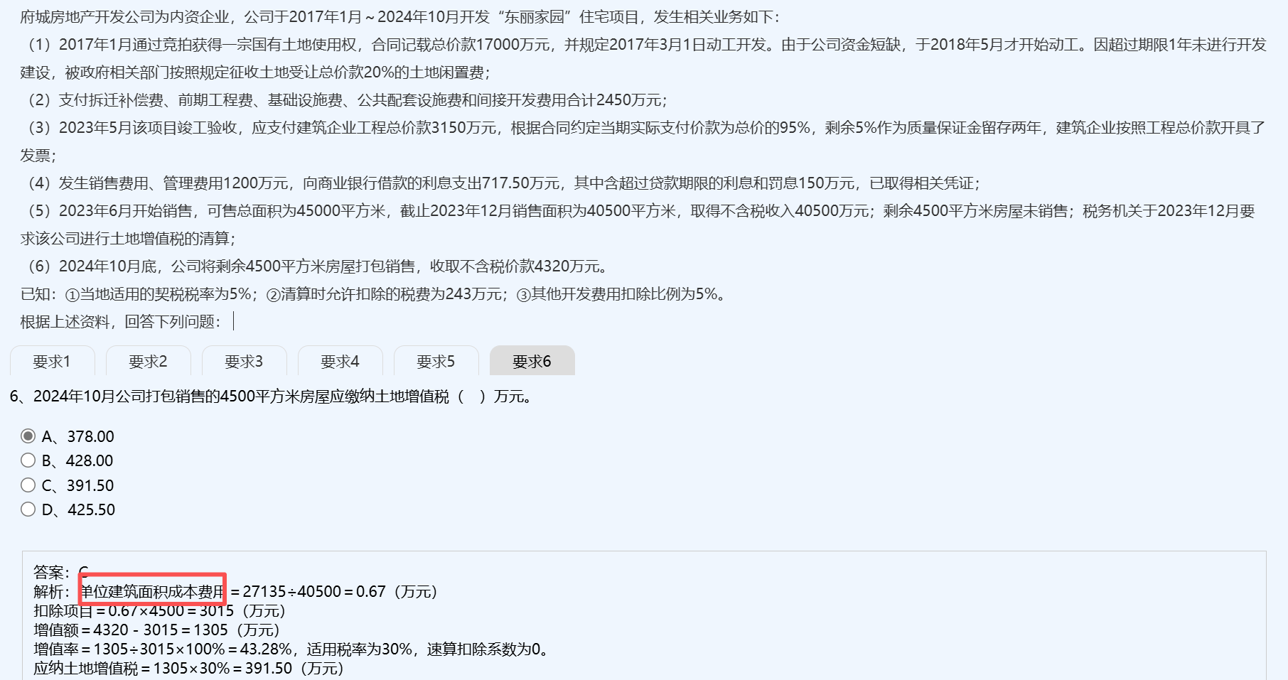 計(jì)算土地增值稅時(shí),單位建筑面積成本費(fèi)用僅在清算后尾盤銷售(如本題2024年10月打包銷售剩余房屋)時(shí)使用,目的是根據(jù)已清算項(xiàng)目的單位成本,按面積分?jǐn)偪鄢?xiàng)目。