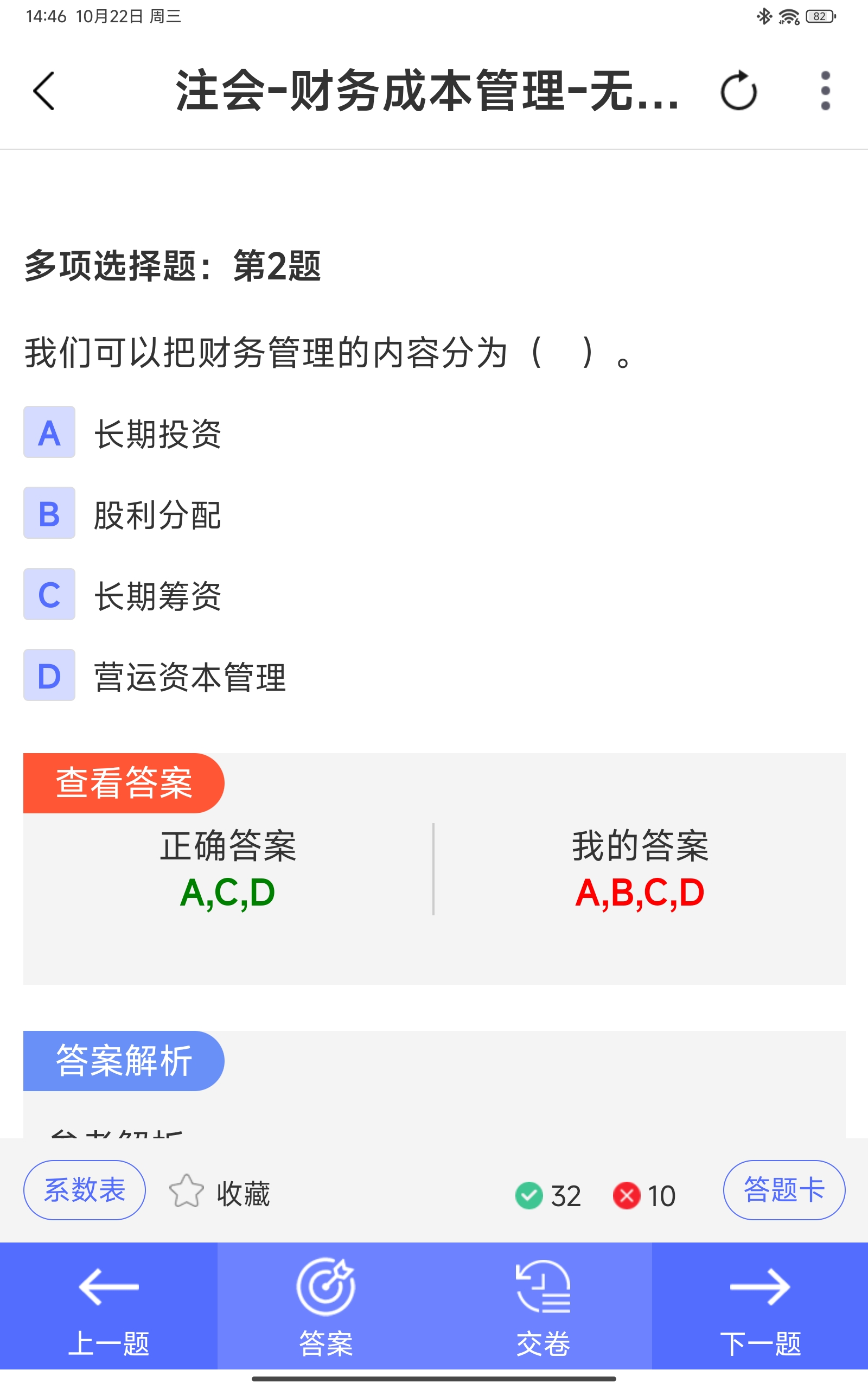 在大學財務管理教材中,通常將財務管理內(nèi)容分為籌資、投資、營運和分配四大板塊。但本題的選項設(shè)置中,“股利分配”(B)未被選為正確答案,是因為它屬于“分配”范疇中的一個具體環(huán)節(jié),而題目中的 D 選項“營運資本管理” 實際上包含了短期資金運作與分配決策的協(xié)調(diào),但不等同于股利分配。
