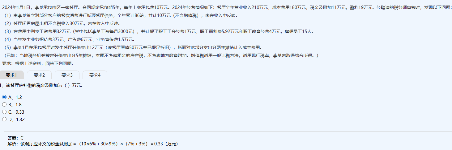 但若按題目給出的解析邏輯,忽略地方教育費(fèi)附加,則結(jié)果為0.33,選C。