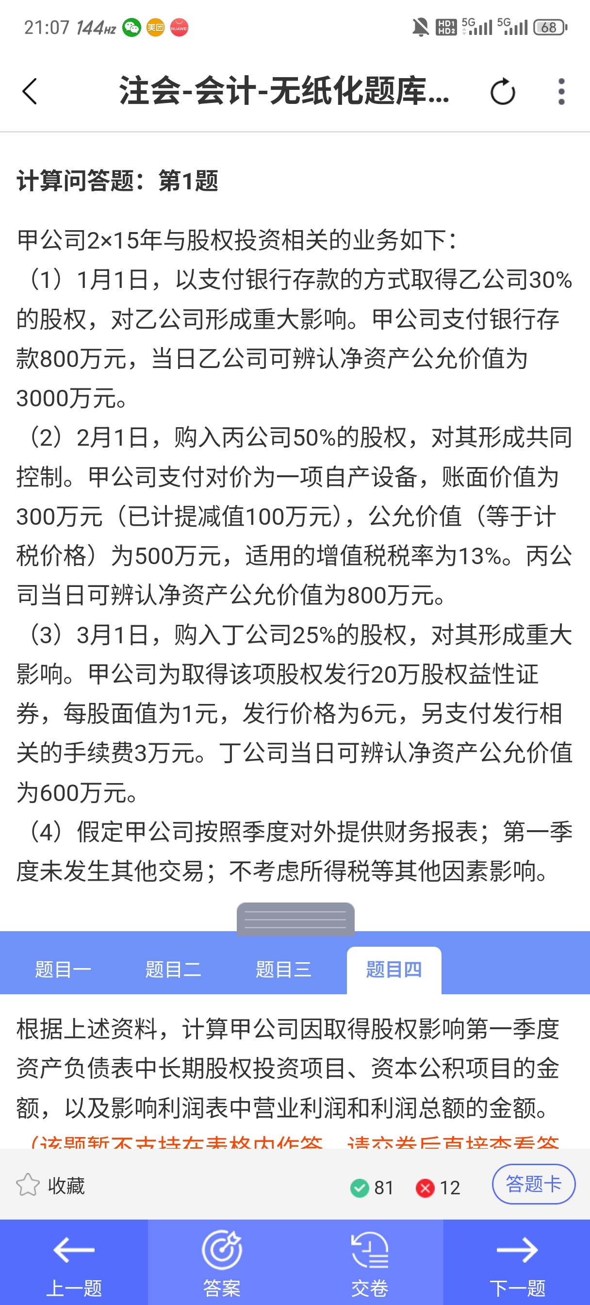 - 甲公司以公允價值500萬元的自產設備作為對價取得丙公司50%股權,該設備賬面價值300萬元(含減值100萬元)。