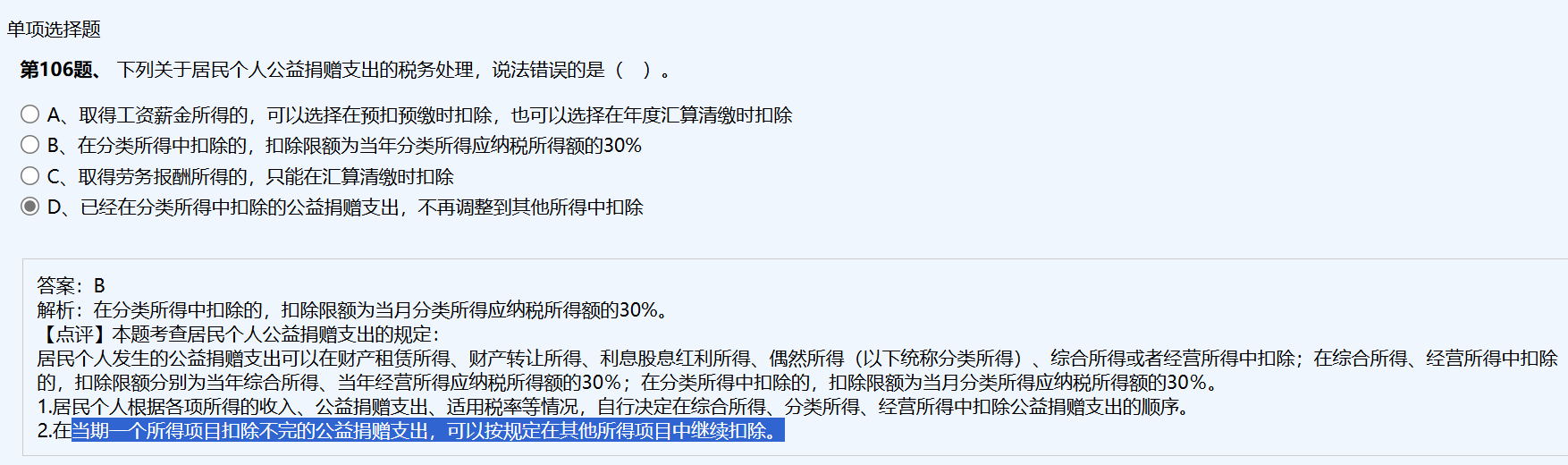 關(guān)鍵在于:D選項(xiàng)說(shuō)的是“已經(jīng)在分類所得中扣除的公益捐贈(zèng)支出,不再調(diào)整到其他所得中扣除” —— 這是正確的。
