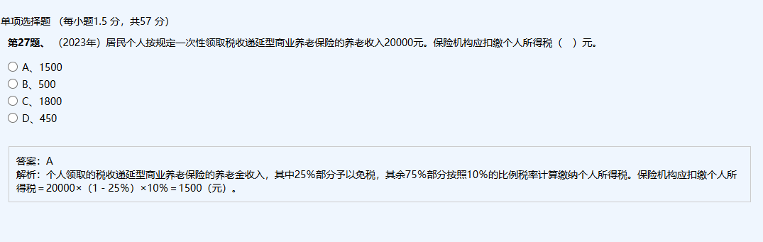 本題考查的是稅收遞延型商業(yè)養(yǎng)老保險(xiǎn),其規(guī)定是免征25%,其余75%按10%納稅,因此應(yīng)為:
