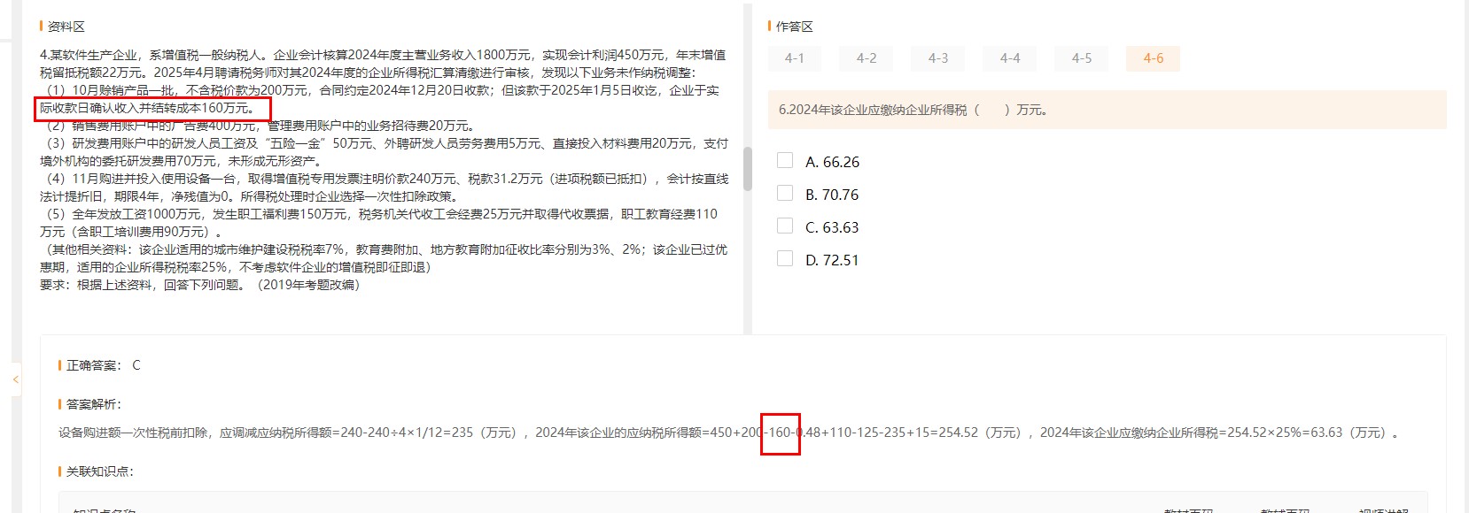 因此,在匯算清繳時(shí),需要調(diào)增2024年收入和成本,成本部分應(yīng)調(diào)增160萬(wàn)元,所以稅前扣除時(shí)要加回160萬(wàn)元(即減去該成本),影響應(yīng)納稅所得額。