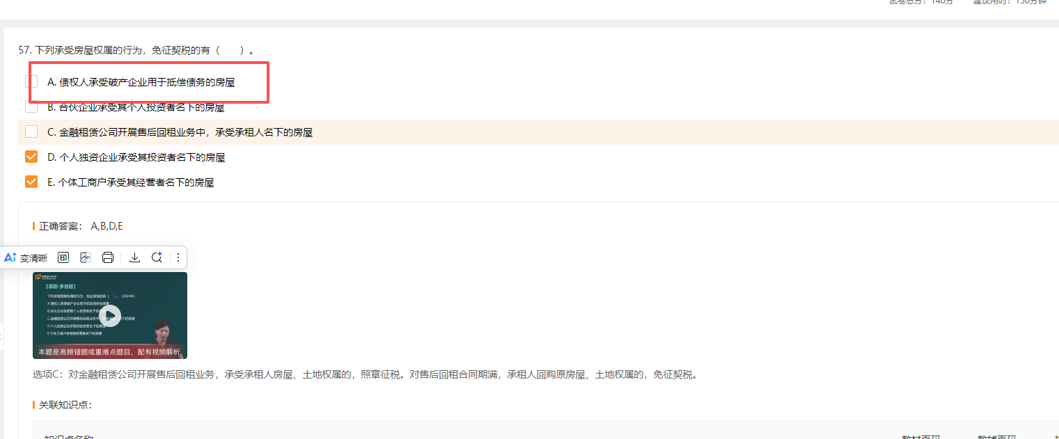 A選項中,債權人承受破產(chǎn)企業(yè)用于抵債的房屋,免征契稅,不是印花稅。契稅和印花稅是不同稅種,此處涉及的是契稅。