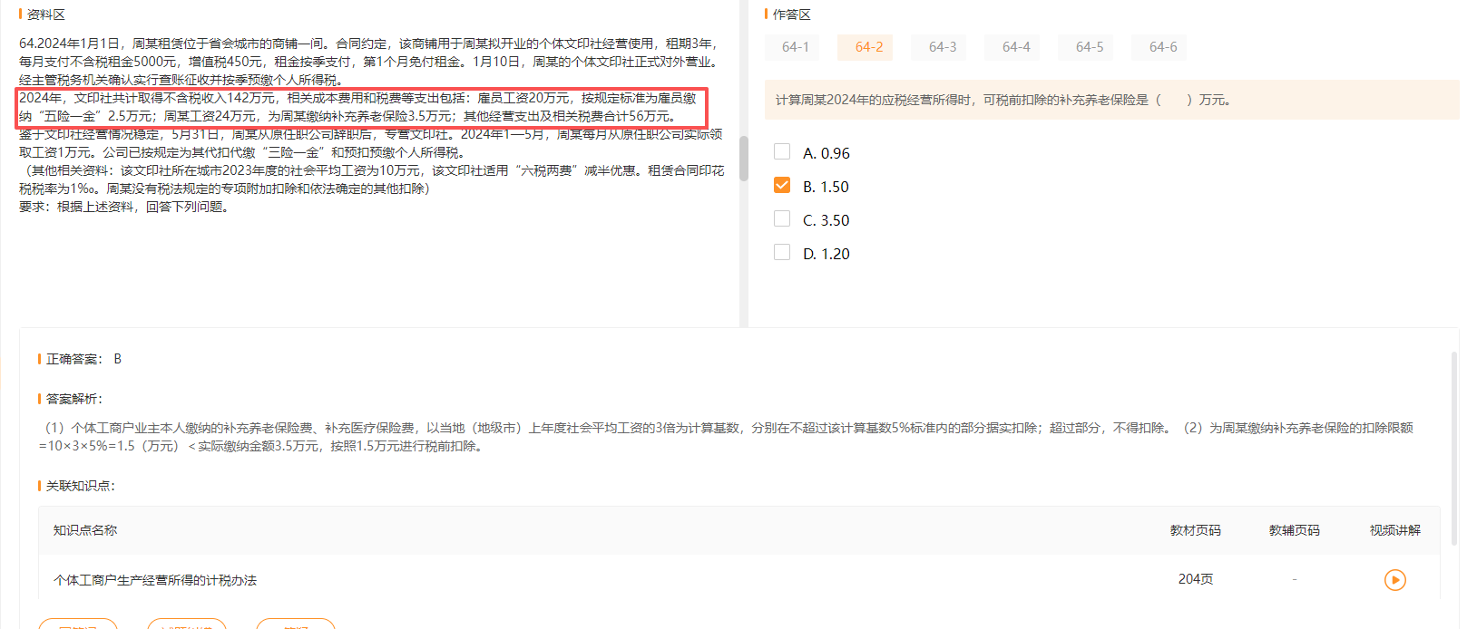 根據(jù)政策,個體工商戶業(yè)主為自己繳納的補(bǔ)充養(yǎng)老保險,不能稅前扣除,但本題中是“為周某繳納”——結(jié)合上下文,實際應(yīng)理解為為員工繳納,且題目明確指出是“周某繳納”的費(fèi)用,因此這里存在表述歧義。
