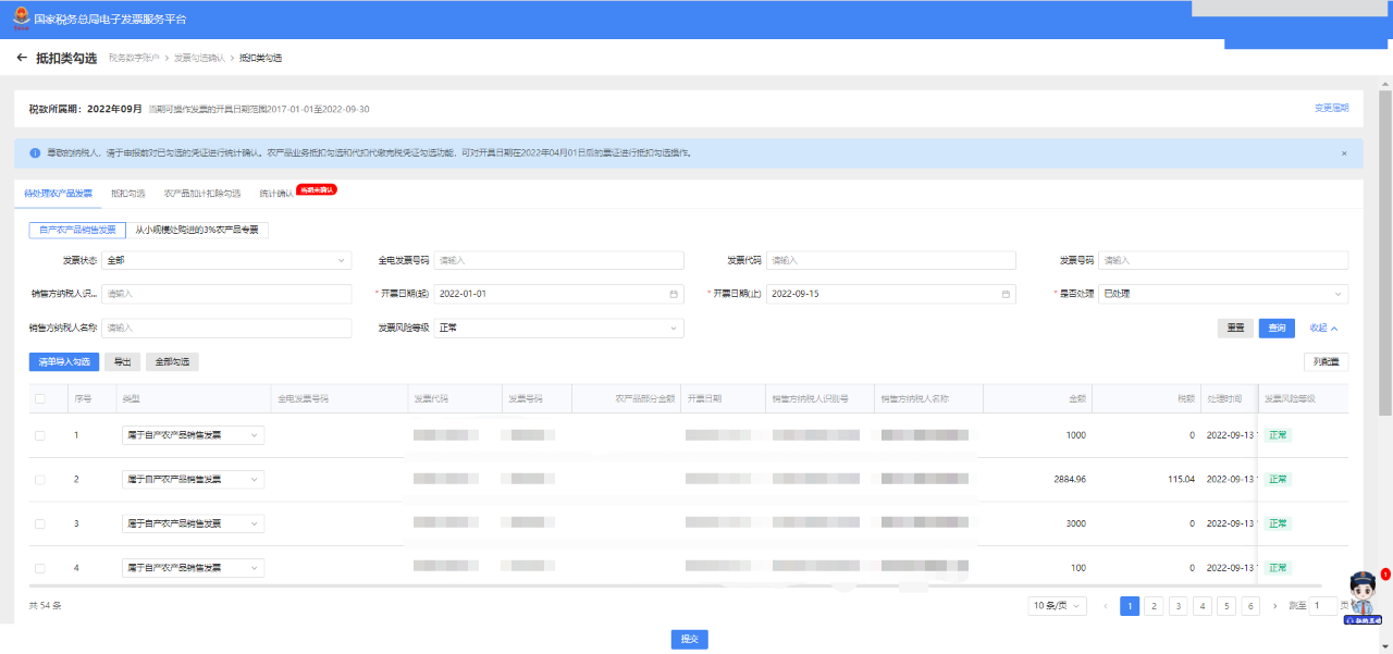 第三步:錄入紅字必填項(xiàng),點(diǎn)擊【查詢】后,系統(tǒng)將帶出需要勾選確認(rèn)的農(nóng)產(chǎn)品發(fā)票信息,您可根據(jù)您的實(shí)際情況,進(jìn)行勾選確認(rèn)后提交即可完成。