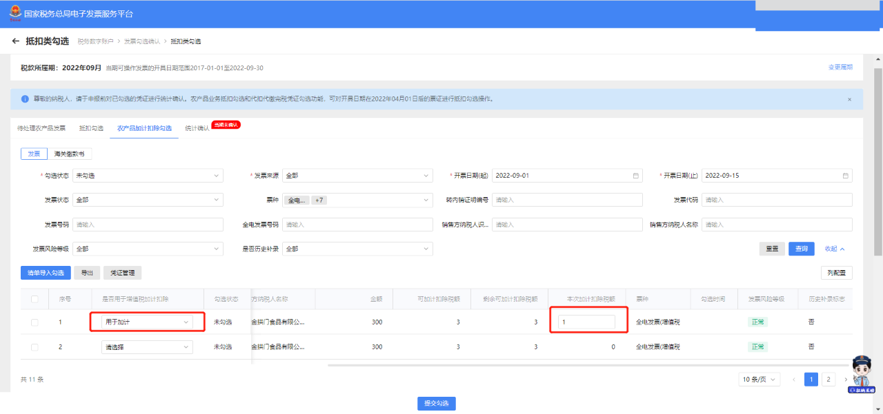 符合條件的農(nóng)產(chǎn)品深加工企業(yè),在執(zhí)行完上述操作后,需要進(jìn)行農(nóng)產(chǎn)品加計(jì)扣除時(shí),得再次選擇【抵扣類勾選】重新進(jìn)入系統(tǒng),選擇“農(nóng)產(chǎn)品加計(jì)扣除勾選”,根據(jù)需要輸入或選擇相關(guān)查詢條件,點(diǎn)擊【查詢】,對(duì)系統(tǒng)彈出的農(nóng)產(chǎn)品發(fā)票信息進(jìn)行勾選確認(rèn)是否用于增值稅加計(jì)扣除,并填寫“本次加計(jì)扣除稅額”。