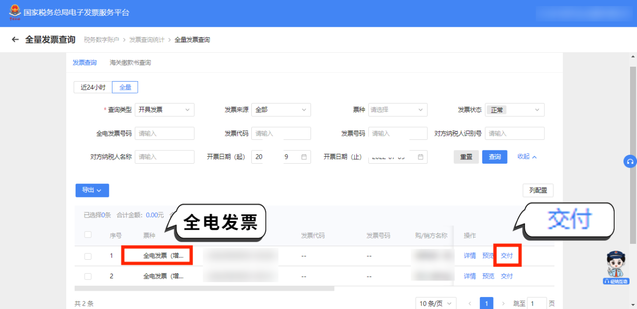 咱們先通過【稅務(wù)數(shù)字賬戶】—【發(fā)票查詢統(tǒng)計(jì)】—【全量發(fā)票查詢】,進(jìn)入發(fā)票查詢頁面,選擇一條全電發(fā)票數(shù)據(jù),并點(diǎn)擊該數(shù)據(jù)操作欄下的【交付】,即可在彈窗中選擇交付方式。