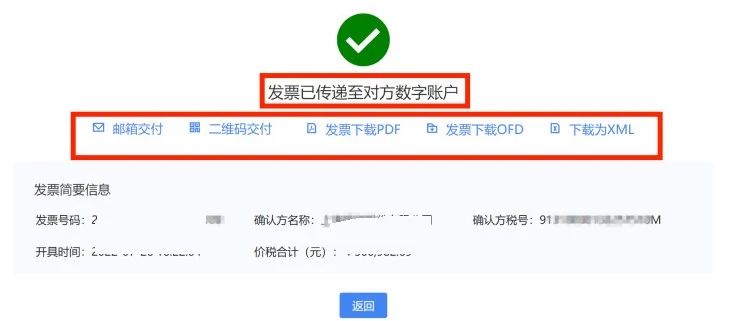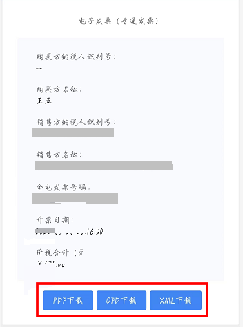 點(diǎn)擊“發(fā)票下載PDF”“發(fā)票下載OFD”“下載為XML”,將發(fā)票下載到本地,再通過其他方式交付。