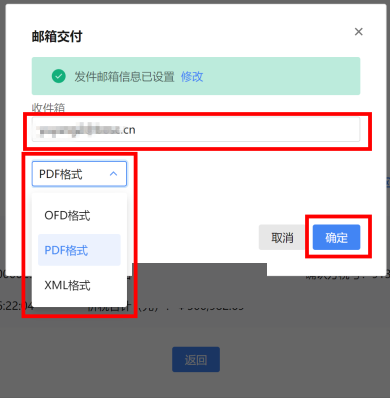 點(diǎn)擊【郵箱交付】,系統(tǒng)會(huì)彈出交付頁面,您錄入接收方電子郵箱后,可以選擇文件格式,點(diǎn)擊【確定】即可將發(fā)票發(fā)送到接收方郵箱中。