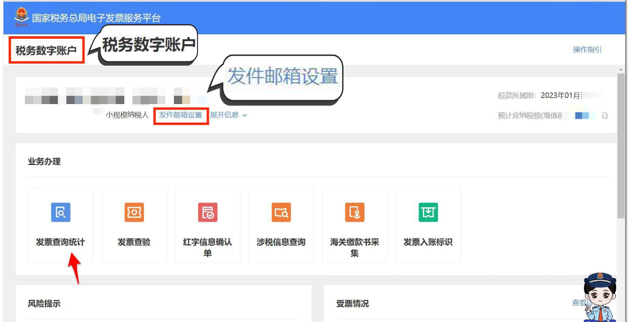 注意:選擇郵箱交付需要先維護(hù)您的郵箱信息,可以直接點(diǎn)擊【稅務(wù)數(shù)字賬戶】-【發(fā)件郵箱設(shè)置】,設(shè)置郵箱信息。