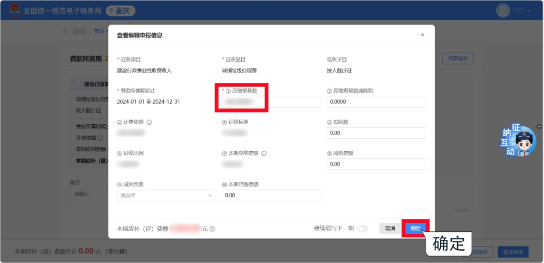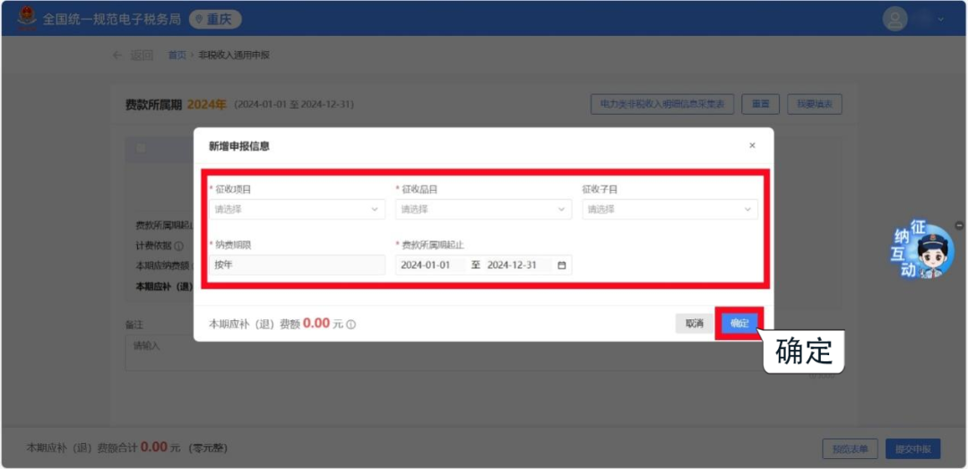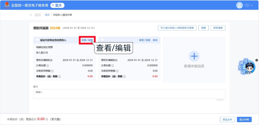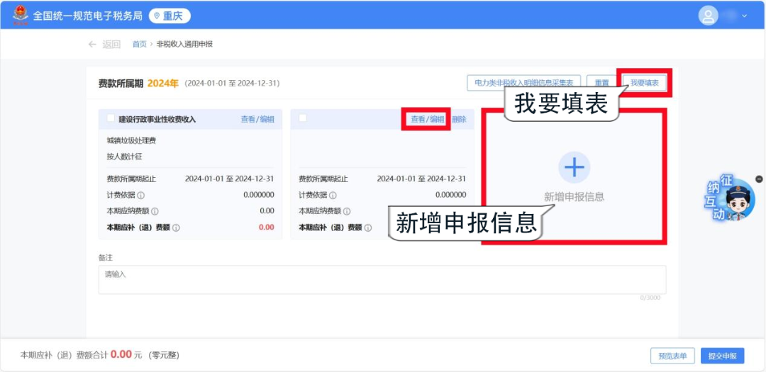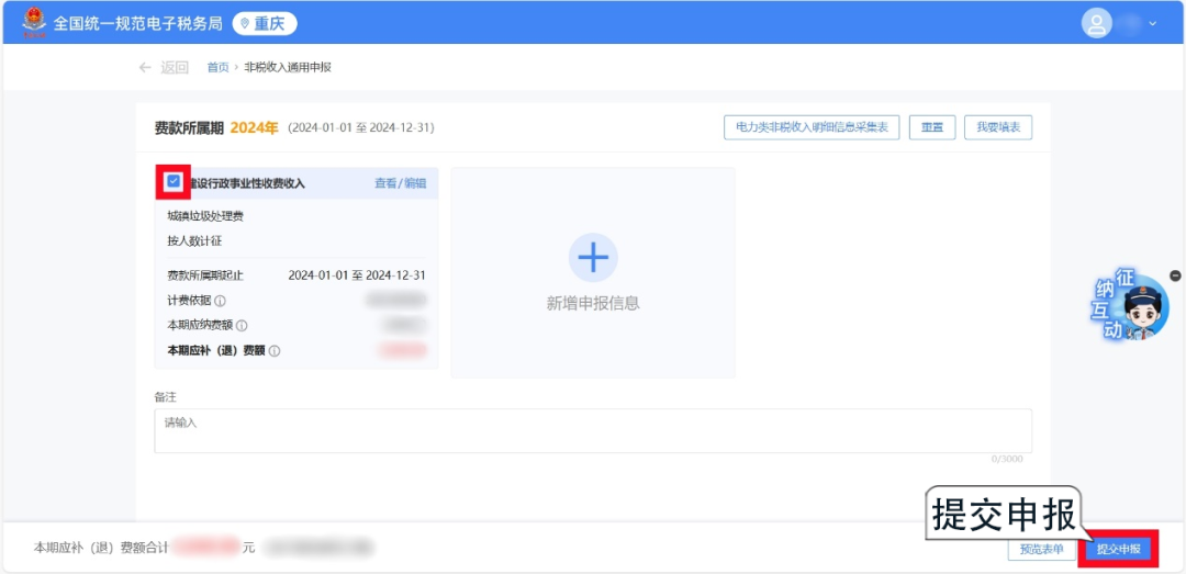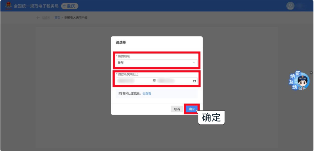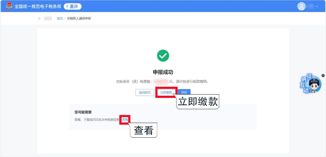 2.根據費種認定情況,選擇申報“納費期限”和“費款所屬期起止”,點擊【確定】,跳轉至申報頁面。 1.若您已認定費種信息,系統會自動顯示已認定的費種信息和已錄入的申報信息,您可以點擊進行【查看/編輯】。 2.系統會自動預填“征收項目”“征收品目”“征收子目”“費款所屬期起止”等信息,您只需填寫“應繳費基數”即可,核對無誤后,點擊【確定】保存申報信息。 1.若您此前未認定費種信息,需要先點擊【新增申報信息】,或點擊【我要填表】,手動添加申報信息。 2.根據實際情況錄入“征收項目”“征收品目”等信息后,點擊【確定】保存申報信息。 注意:選擇不同的征收項目及征收品目,系統會自動帶出該項目需填寫的相關信息,您根據提示進行填寫即可。 勾選需要申報的非稅收入項目,確認“計費依據”“本期應納費額”等信息無誤后,點擊【提交申報】即可。 系統顯示“申報成功”后,您可以點擊【立即繳款】進行費款繳納,也可以點擊【查看】按鈕,下載或打印報表信息。