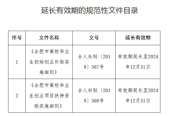 根據(jù)市政府辦公室《關(guān)于進(jìn)一步加強(qiáng)行政機(jī)關(guān)規(guī)范性文件管理的通知》(合政辦〔2007〕75號(hào))規(guī)定,我單位對(duì)有效期即將屆滿(mǎn)的規(guī)范性文件進(jìn)行了梳理評(píng)估。經(jīng)評(píng)估,由市人社局、市財(cái)政局印發(fā)的《合肥市高校畢業(yè)生初始創(chuàng)業(yè)補(bǔ)貼實(shí)施細(xì)則》(合人社秘〔2018〕367號(hào))、《合肥市高校畢業(yè)生創(chuàng)業(yè)項(xiàng)目扶持資助實(shí)施細(xì)則》(合人社秘〔2018〕368號(hào))需繼續(xù)施行,其有效期延至2024年12月31日。在繼續(xù)施行期間,該文件如有修改或廢止,以新修改文件的公布或廢止的通知為準(zhǔn)。現(xiàn)將《延長(zhǎng)有效期的規(guī)范性文件目錄》予以公布。
