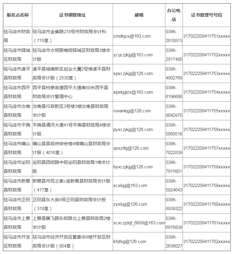 ③需要辦理證書郵寄業(yè)務(wù)的考生請(qǐng)將本人身份證正反面照片、姓名、地址、聯(lián)系電話發(fā)送至各縣區(qū)會(huì)計(jì)股郵箱(詳見下表)。