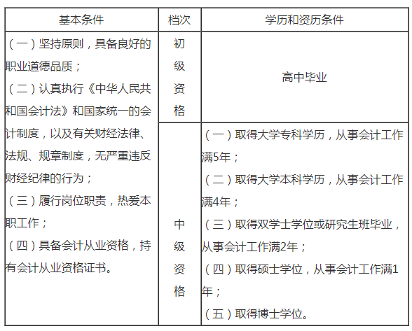 四、對(duì)通過全國統(tǒng)一考試,取得經(jīng)濟(jì)、統(tǒng)計(jì)、審計(jì)專業(yè)技術(shù)中、初級(jí)資格的人員,并具備本規(guī)定所列的基本條件,均可報(bào)名參加相應(yīng)級(jí)別的會(huì)計(jì)專業(yè)技術(shù)資格考試。