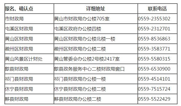 2、報(bào)名確認(rèn):市財(cái)政局及各區(qū)縣財(cái)政局報(bào)名點(diǎn)可同時(shí)進(jìn)行資格審查、繳費(fèi)、確認(rèn)(各報(bào)名點(diǎn)詳細(xì)地址、聯(lián)系電話見附件)。