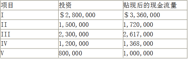 企業(yè)的目標(biāo)是所有者權(quán)益最大化。為了要做到這個(gè),Zinx要讓凈現(xiàn)值 (NPV)法評(píng)估資本項(xiàng)目的未來(lái)增量現(xiàn)金流的現(xiàn)值最大化。Zinx應(yīng)該選擇能產(chǎn)生最高NPV的項(xiàng)目組合。I, IV和V的組合有最高的NPV$928,000計(jì)算如下:I, IV和V的NPV =($3,360,000-$2,800,000)+($1,368,000-$1,200,000)+($1,000,000-800,000)= $928,000。使用相似的方法,II, III和IV有NPV$705,000,II, III和V有NPV$737,000,同樣,I和II有NPV$780,000?!驹擃}針對(duì)“凈現(xiàn)值(NPV)分析”知識(shí)點(diǎn)進(jìn)行考核】