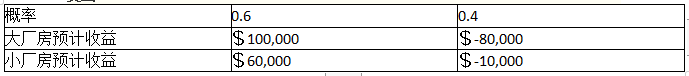 建造任何一種廠房的期望收益是成功的和不成功的預(yù)計收益乘以相應(yīng)的概率,然后進行加總。大廠房的期望收益=0.6×$100,000-0.4×$80,000=$28,000;小廠房的期望收益=0.6×$60,000-0.4×$10,000=$32,000。建造小廠房的選項有最高的期望價值,因而被推薦。綜上,本題應(yīng)選擇A選項?!驹擃}針對“期望值”知識點進行考核】
