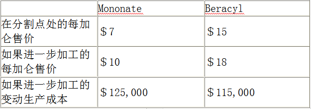 Oakes公司在聯(lián)產(chǎn)品生產(chǎn)過程中生產(chǎn)了40,000加侖的Mononate和60,000加侖的Beracyl,聯(lián)產(chǎn)品成本為$250,000。Oakes基于每種產(chǎn)品的產(chǎn)量在聯(lián)產(chǎn)品之間進(jìn)行成本分?jǐn)偂ononate和 Beracyl 都可以在分割點處以半成品的狀態(tài)出售,也可以進(jìn)一步加工。兩種產(chǎn)品的附加信息如下公司成本會計部門的一個助理無意中聽到“……當(dāng)