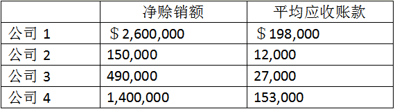 四家公司的信用期均為30天。根據(jù)每家公司的凈賒銷額和20x8的平均應(yīng)收賬款凈額,哪個公司在應(yīng)收賬款收款遇到的問題最多?