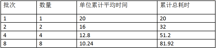 在累計(jì)平均時(shí)間模型下,當(dāng)產(chǎn)量累積到第8個(gè),單位產(chǎn)品的平均耗時(shí)和累計(jì)總耗時(shí)如下
