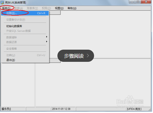 2、在彈出的“用友U8[系統(tǒng)管理]”窗口里點(diǎn)擊“系統(tǒng)”,在彈出的菜單中點(diǎn)擊“注冊(cè)”。
