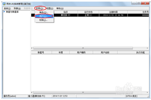 5、系統(tǒng)管理員admin的初始密碼為空,一般在實(shí)際使用軟件的時(shí)候,需要為系統(tǒng)管理員設(shè)置密碼。首先點(diǎn)擊“權(quán)限”,在彈出的菜單中選擇“用戶”。