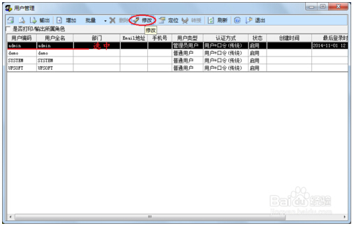 6、在彈出的“用戶管理”窗口中,選定用戶“admin”,如圖點(diǎn)擊“修改”。