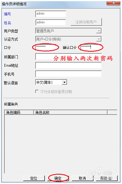 7、在彈出的“操作員詳細(xì)情況”中的“口令”與“確定口令”編輯欄里輸入兩次新密碼,點(diǎn)擊“確定”即可。將來登錄系統(tǒng)管理的時(shí)候(第3步),就需要輸入密碼后才可以登錄了。