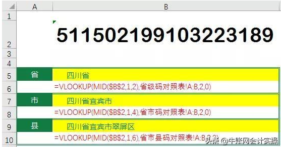 MID函數(shù)在B2單元格的身份證號(hào)中,提取出從第1位開始的連續(xù)兩位字符,就是“51”;再把“51”帶入到VLOOKUP函數(shù)中,并在《省級(jí)碼對(duì)照表》中的A、B兩列處進(jìn)行索引即可。B7、B9單元格的市、縣索引方式也是一樣的,但是一定要記住,索引省,用到身份證的前兩位;索引市,要用到身份證的前4位。索引出XX省XX市的格式,不能直接使用第3~4位,因?yàn)闀?huì)和其他的省市碼重復(fù);縣級(jí)代碼同理,需要索引身份證號(hào)的前6位,不可單獨(dú)索引第5~6位。