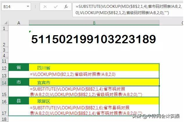 =SUBSTITUTE(VLOOKUP(MID($B$2,1,4),省市碼對(duì)照表!A:B,2,0),VLOOKUP(MID($B$2,1,2),省級(jí)碼對(duì)照表!A:B,2,0),"")