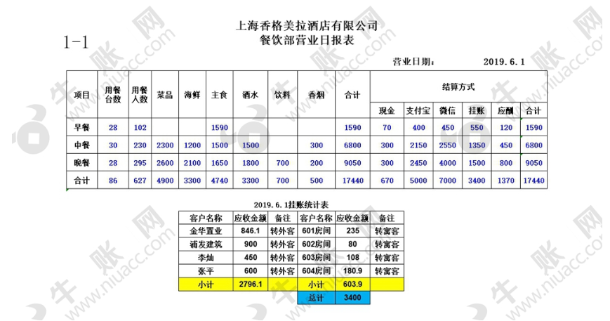 下面是一家酒店某一天日常銷售業(yè)務(wù)的截圖匯總