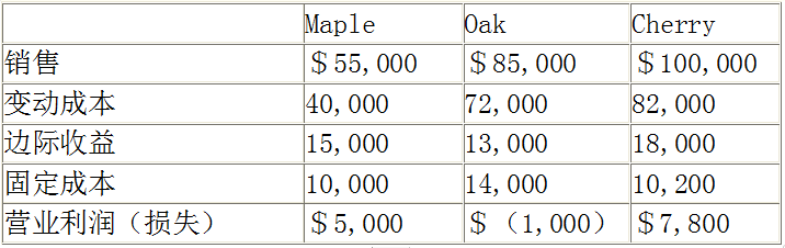 家具公司現(xiàn)在有3個(gè)部門:Maple,Oak和Cherry。Oak經(jīng)營狀況欠佳,公司正在考慮關(guān)閉該部門。如果這樣做,與Oak部門相關(guān)的利潤就會消失,但會節(jié)約相關(guān)的變動成本。同時(shí)分配到Oak的50%的固定成本也會消失。按部門劃分編制的損益表如下