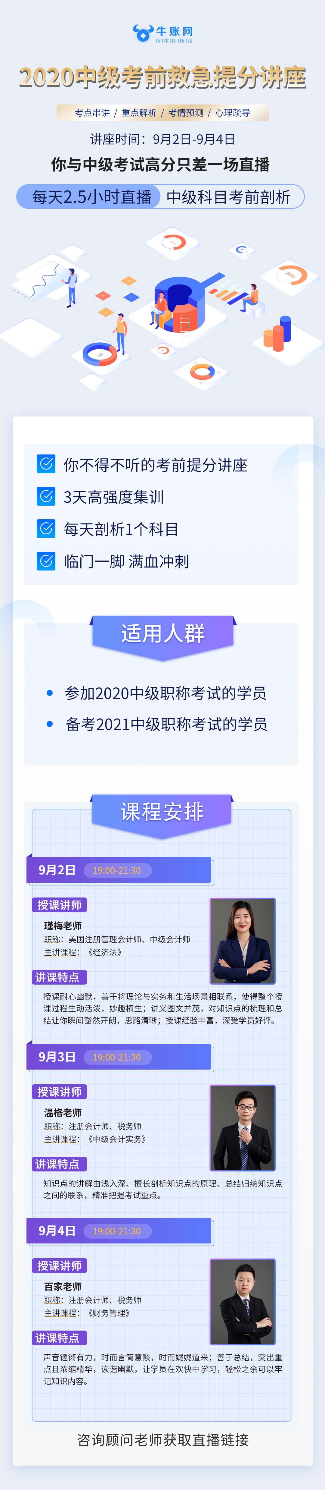 2020中級(jí)考試已進(jìn)入倒計(jì)時(shí),考前焦慮在所難免,只要行動(dòng)起來(lái),保持好每天的復(fù)習(xí)節(jié)奏,放松心情,就不會(huì)被考前焦慮所打到。所以,中級(jí)考生們考前福利來(lái)咯!特約牛賬網(wǎng)3位牛師考前3天每天花2.5小時(shí)為大家梳理考試重難點(diǎn),在線直播和大家一起聊一聊中級(jí)考試的那些事,治愈你的小焦慮,給你滿滿的安全感!