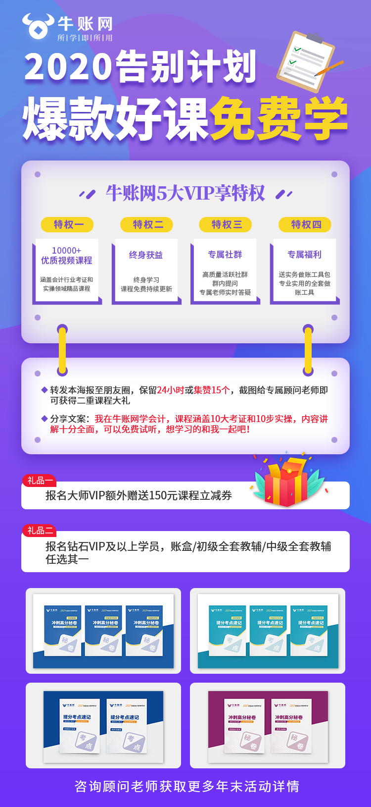 2020年牛賬網(wǎng)告別計(jì)劃正式開啟,爆款好課免費(fèi)學(xué)習(xí),心動的你,此時(shí)不行動,更待何時(shí)呢?為了更好的反饋學(xué)員,牛賬網(wǎng)2020年告別計(jì)劃活動,將于12月28日正式開始,12月31日截止,活動內(nèi)容將會有一下優(yōu)惠: