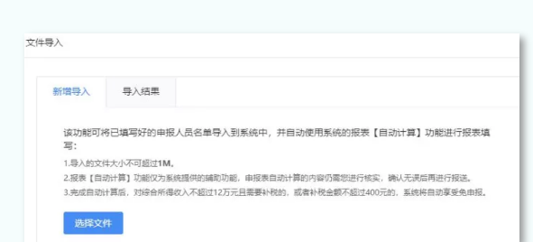 人員名單填寫完成后,點(diǎn)擊【導(dǎo)入】-【名單生成報(bào)表】,彈出 “文件導(dǎo)入”彈窗,在 “新增導(dǎo)入”將申報(bào)表導(dǎo)入系統(tǒng)。