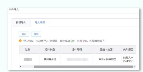 導(dǎo)入操作完成后,可在“導(dǎo)入結(jié)果”標(biāo)簽頁中查看導(dǎo)入結(jié)果。當(dāng)填寫信息不符合規(guī)范時(shí),狀態(tài)可能為失敗,點(diǎn)擊相應(yīng)狀態(tài),可查看具體的失敗提示。根據(jù)提示要求,可在更正相應(yīng)信息后重新導(dǎo)入。