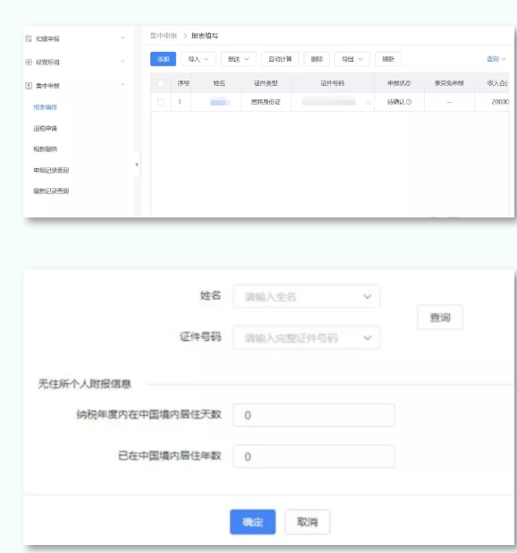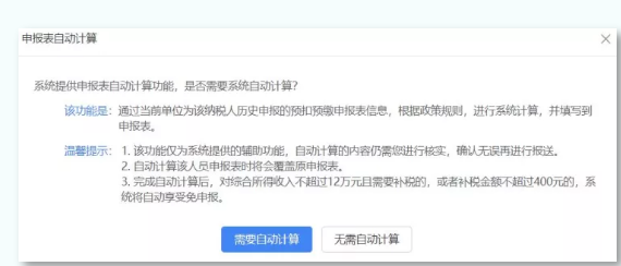 人員信息錄入完成后,點(diǎn)擊【確定】,系統(tǒng)彈出“申報(bào)表自動計(jì)算”選擇頁面。